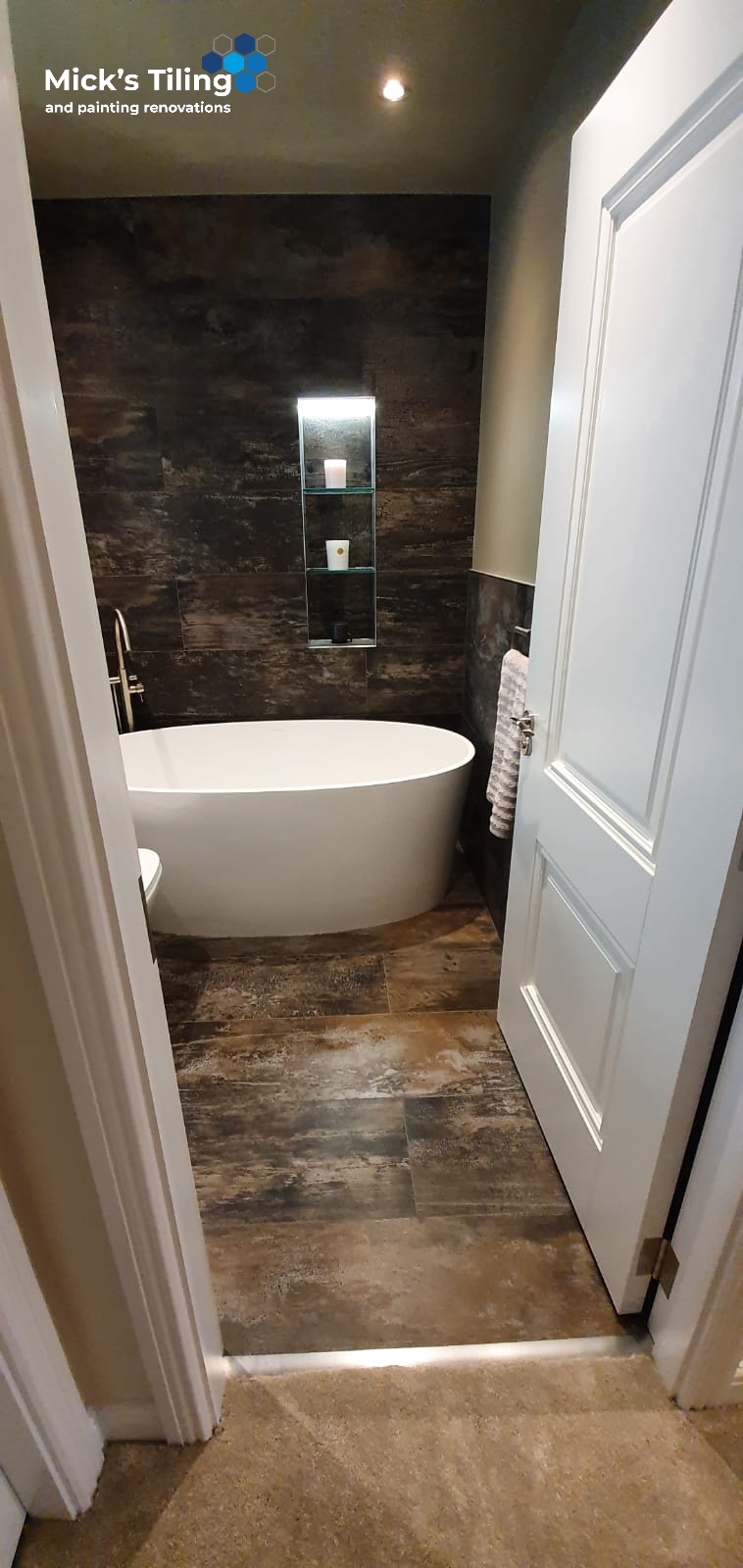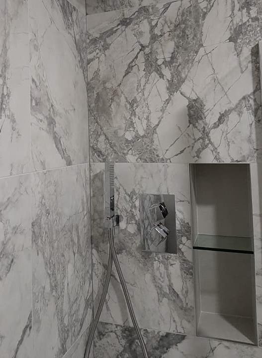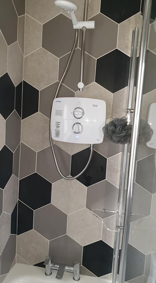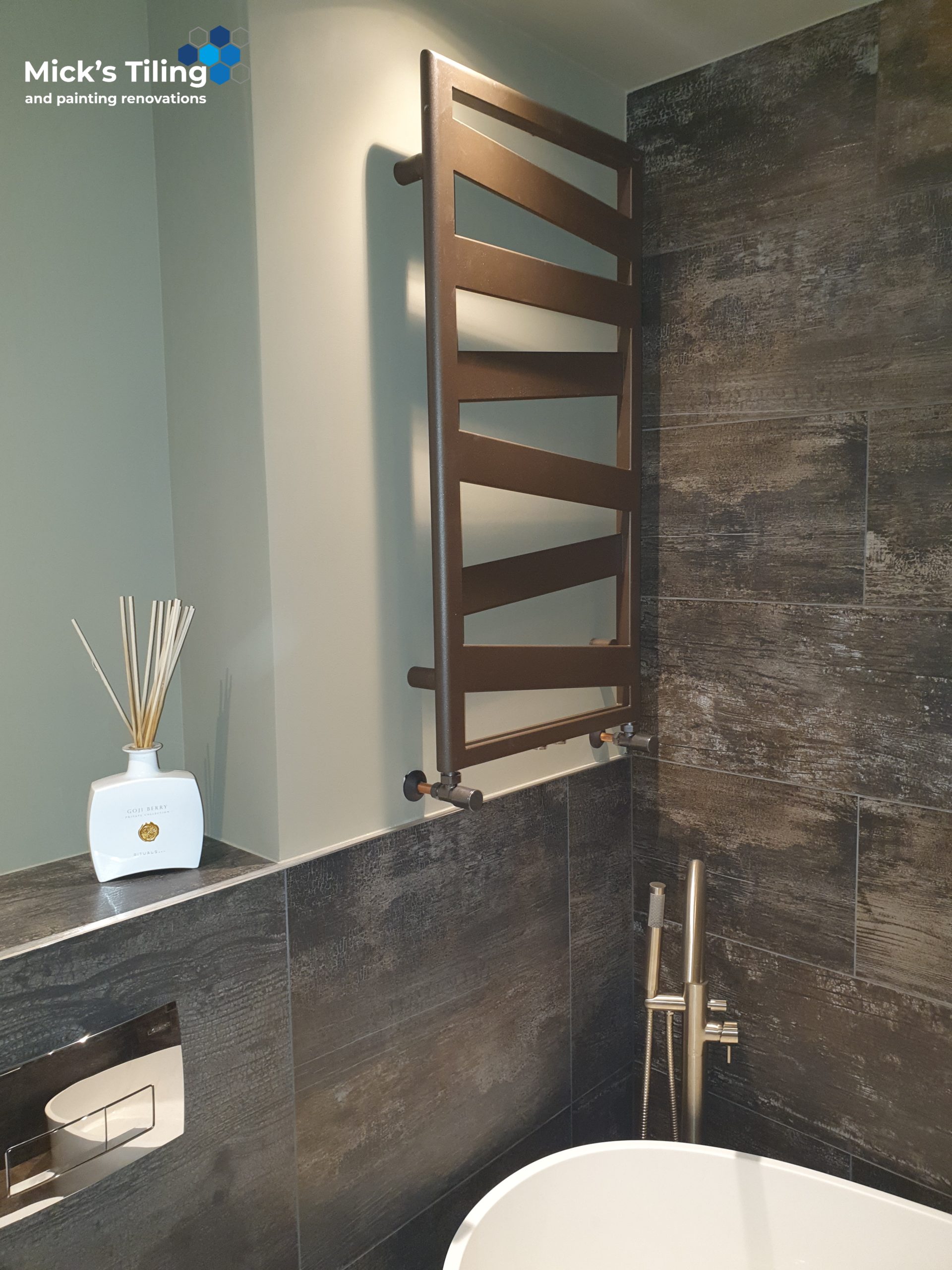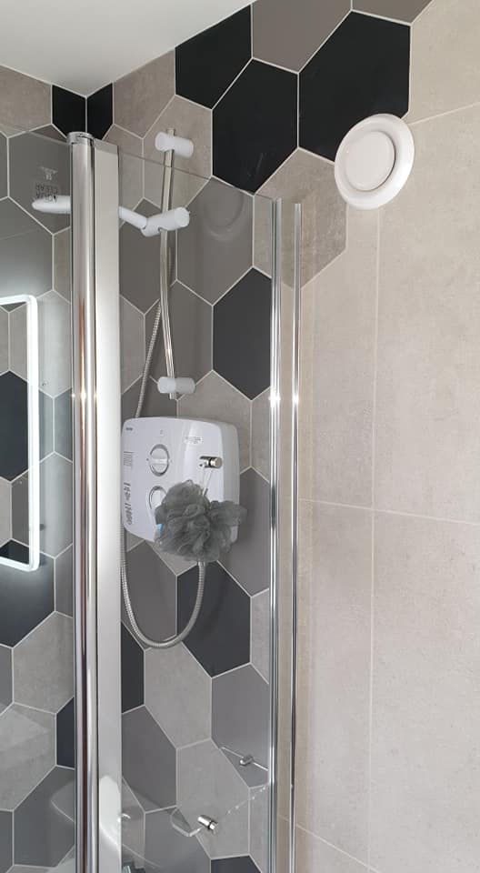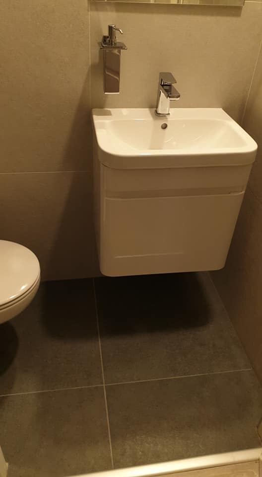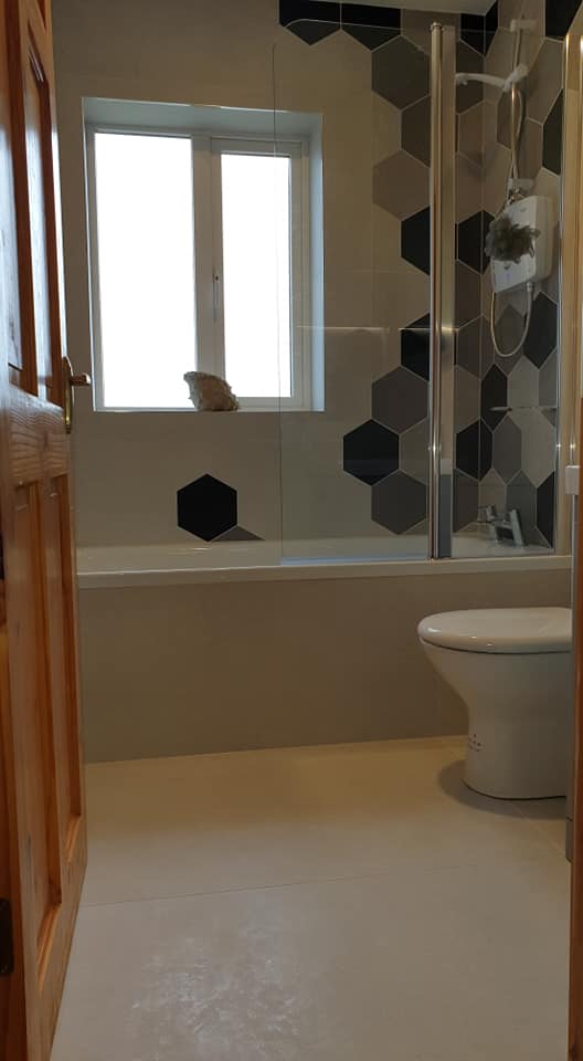 Another bathroom project carried out by our team in Portlaoise. We used large porcelain tiles (120x60cm) on walls and floor but the shower area was intertwined with hexagonal tiles in different shades to complete the look!