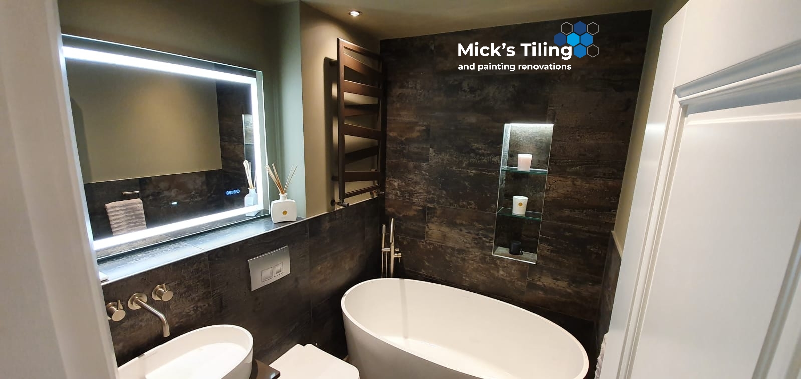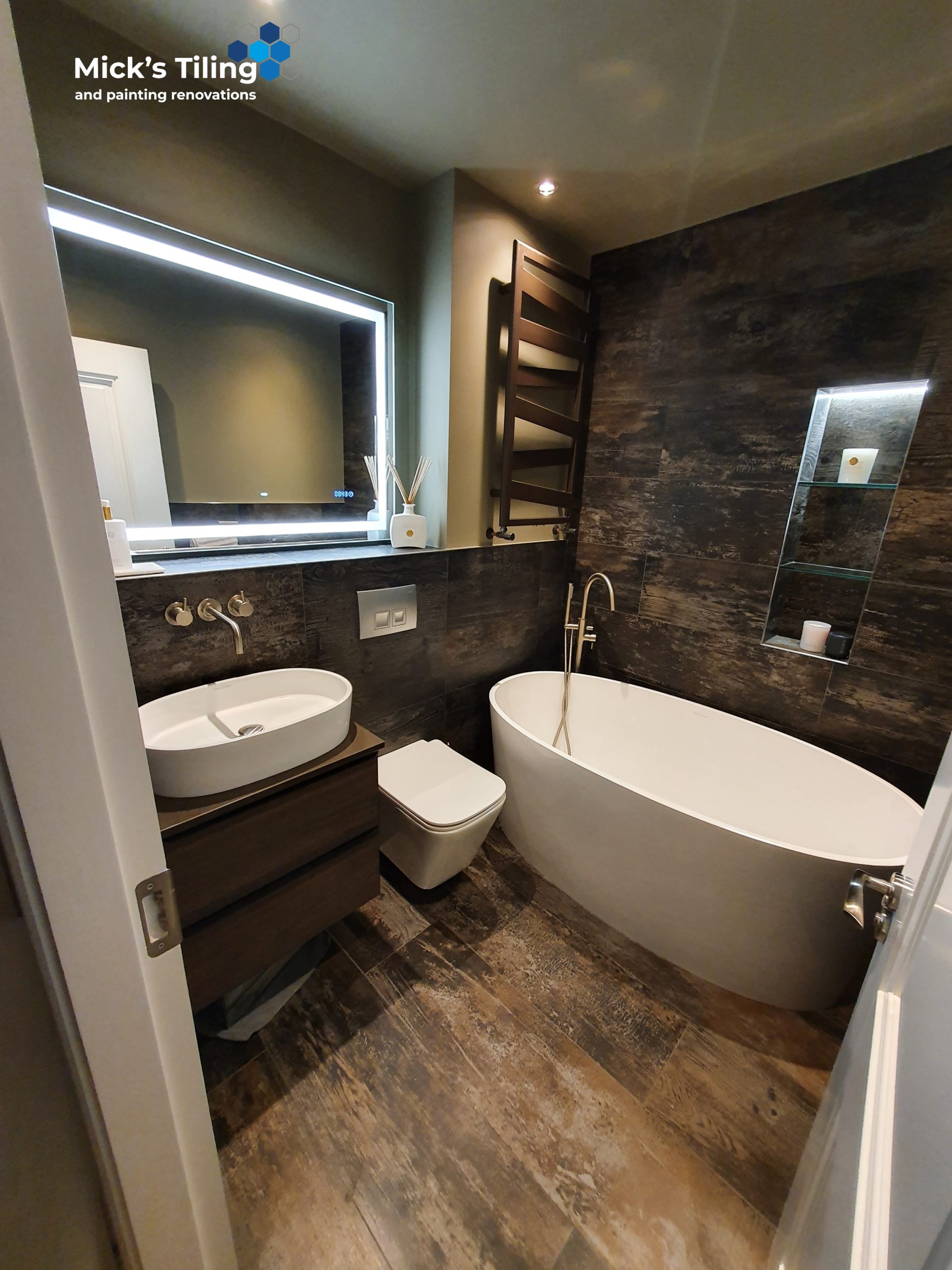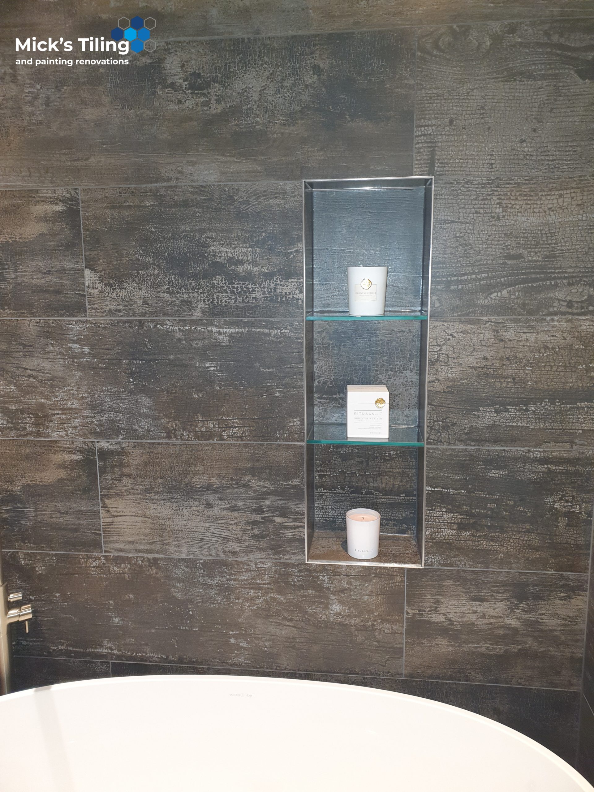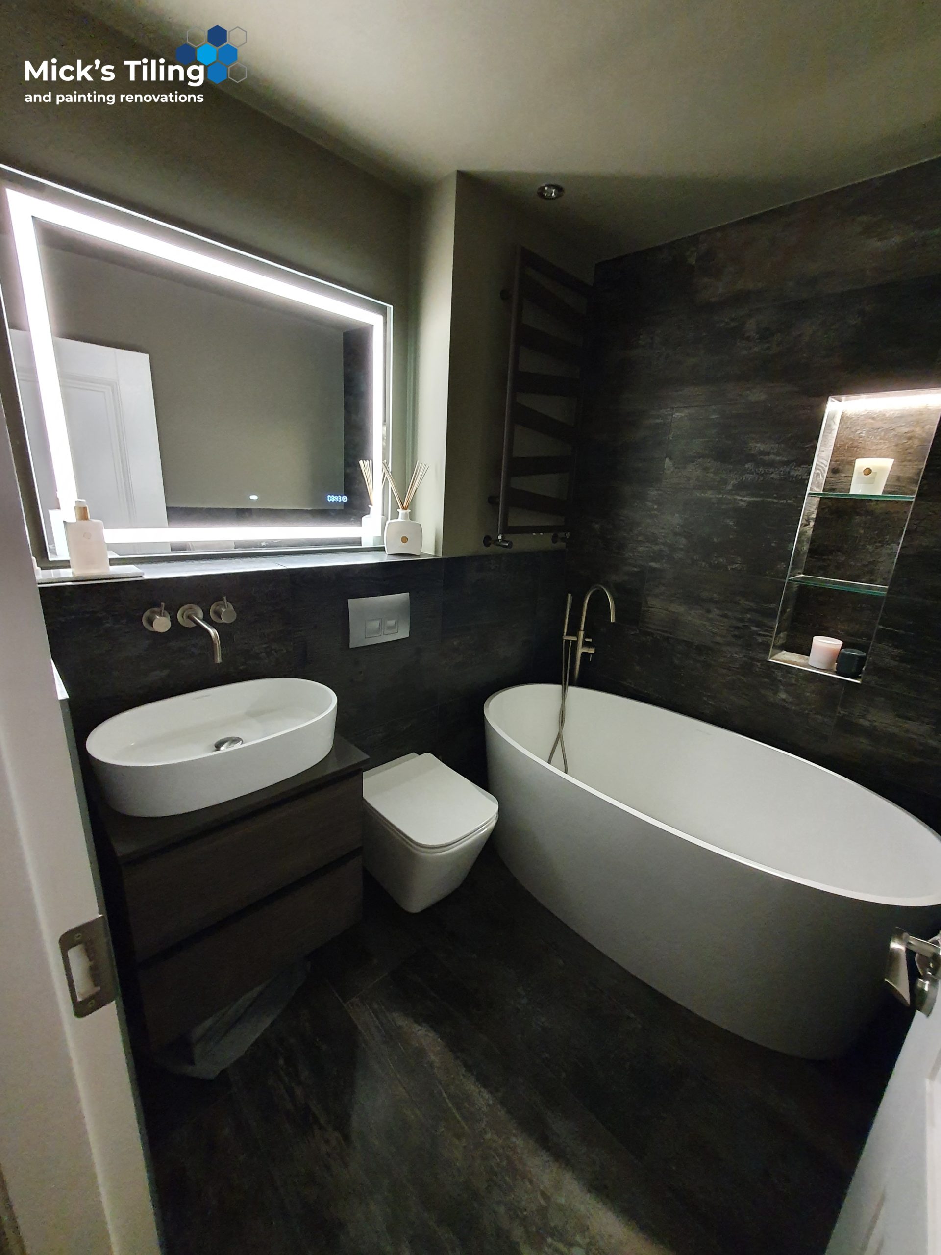 Another bathroom project carried out by our team in Portlaoise. We used large porcelain tiles (120x60cm) on walls and floor but the shower area was intertwined with hexagonal tiles in different shades to complete the look!